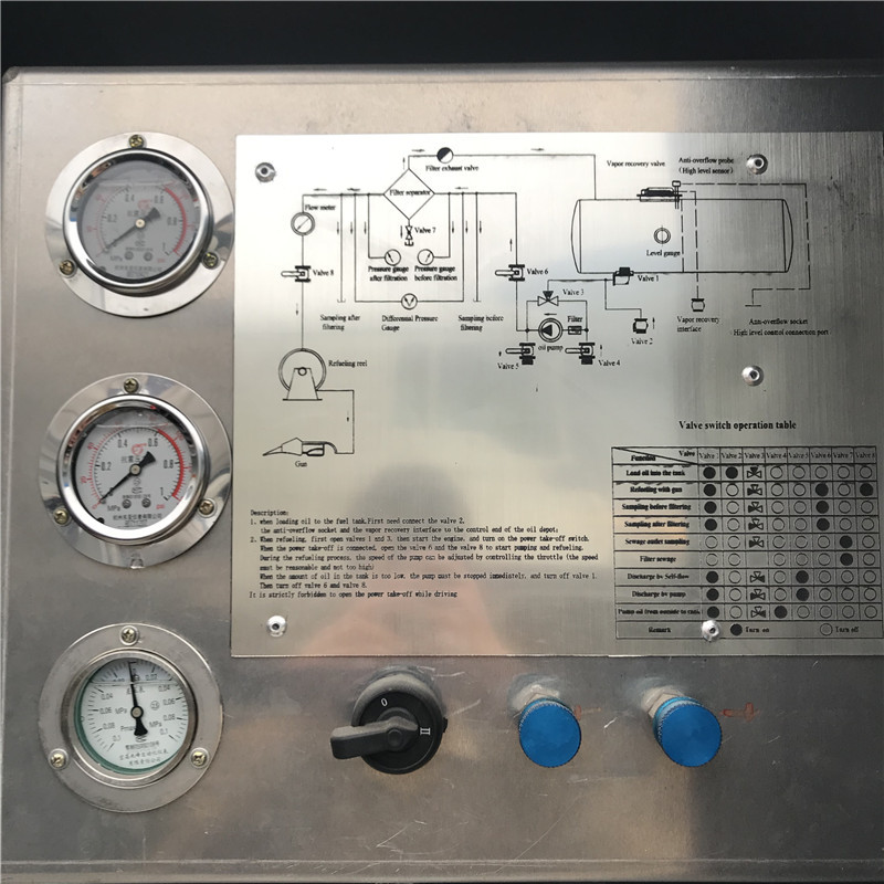 One set of explosion-proof lamp inside the operation cabinet (aluminum alloy), one set of electrostatic reel outside the operation cabinet, refueling pump: aluminum alloy oil pump (mechanical seal type), flowmeter: Hefei Jingda instrument 0.2 accuracy, diameter 50 waist wheel flow juice, filter separator: 5-core filter (including 2 separation and 3 coalescence filter elements). Gravity refueling method: 15m aviation kerosene special hose reel with aviation kerosene special gun, liquid level gauge: 10-inch aluminum alloy dial, operation control: integrated control system.